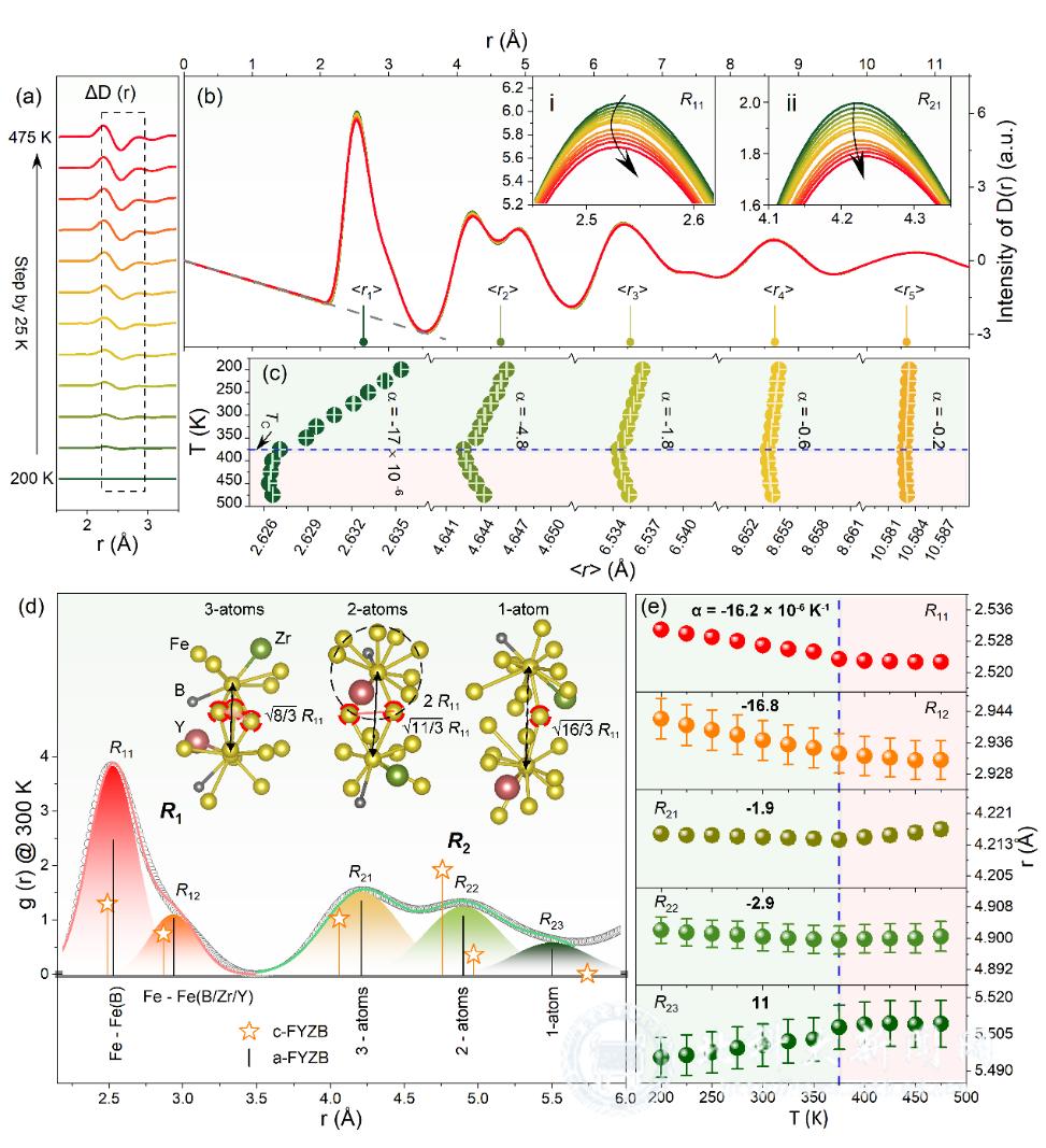 In this study, the USTB team and collaborators observed unexpected NTE in amorphous Fe–Y–Zr–B (a-FYZB) alloys. Between 200–375 K, the a-FYZB alloy displayed an average linear thermal expansion coefficient of –6.7 ppm/K. Remarkably, even after more than 100 heating–cooling cycles below the crystallization temperature, the NTE behavior persisted. In contrast, the crystalline form (c-FYZB) exhibited normal positive thermal expansion (+11.7 ppm/K), highlighting the unique role of “short-range order without long-range periodicity” in amorphous NTE.