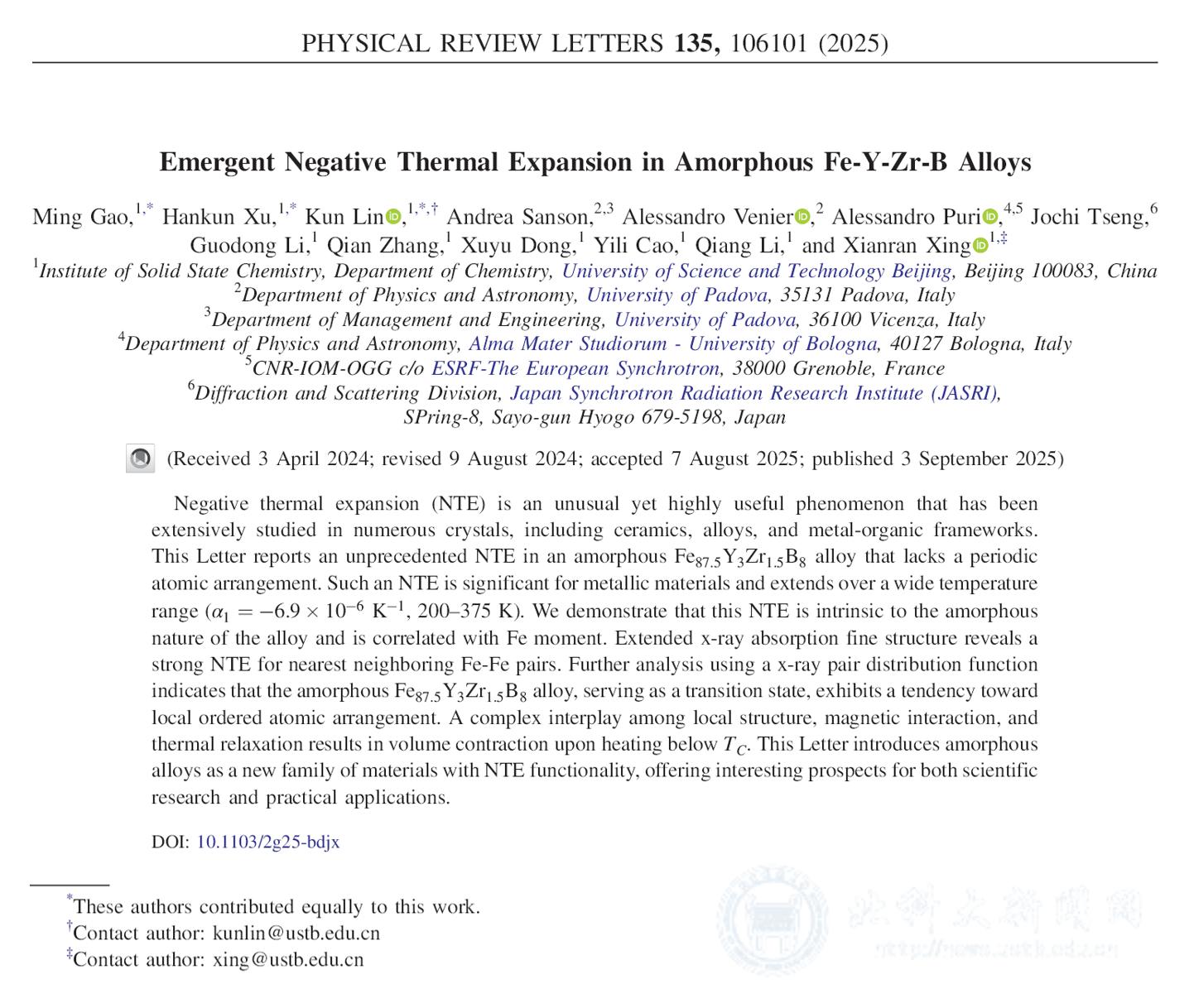 Recently, the research team from the Institute of Solid State Chemistry at our university, in collaboration with international partners, published a major breakthrough in Physical Review Letters. Their work reports the discovery of negative thermal expansion (NTE) in an amorphous solid for the first time. The University of Science and Technology Beijing is the first affiliation and corresponding author unit for this publication.