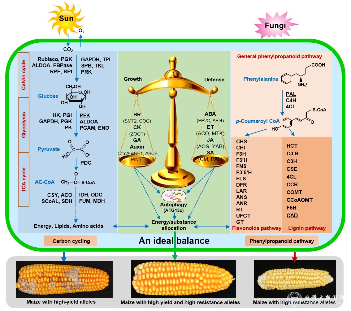 The breeding application of regulatory mechanisms and related gene resources for optimizing maize resistance and increasing yield.