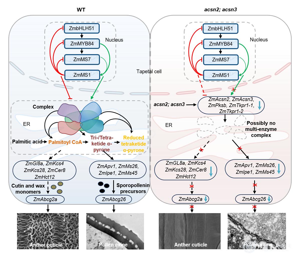 -The team discovered that ZmMS1, a key regulator of pollen wall development, orchestrates a feedback repression loop that controls the activity of ZmACSN2/3–PKSB–TKPR1-1/-2 complexes.